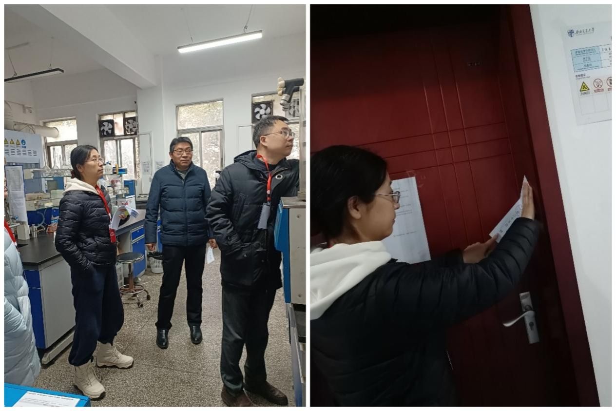 组织开展了2023-2024第一学期寒假前实验室安全大检查,学院实验主管郑晓彤老师带队,智伟、周杰、游天雪、杨利文、熊开琴老师参加。在本次检查中,检查组着重排查实验室安全隐患及寒假中各实验室值班表安排张贴情况。