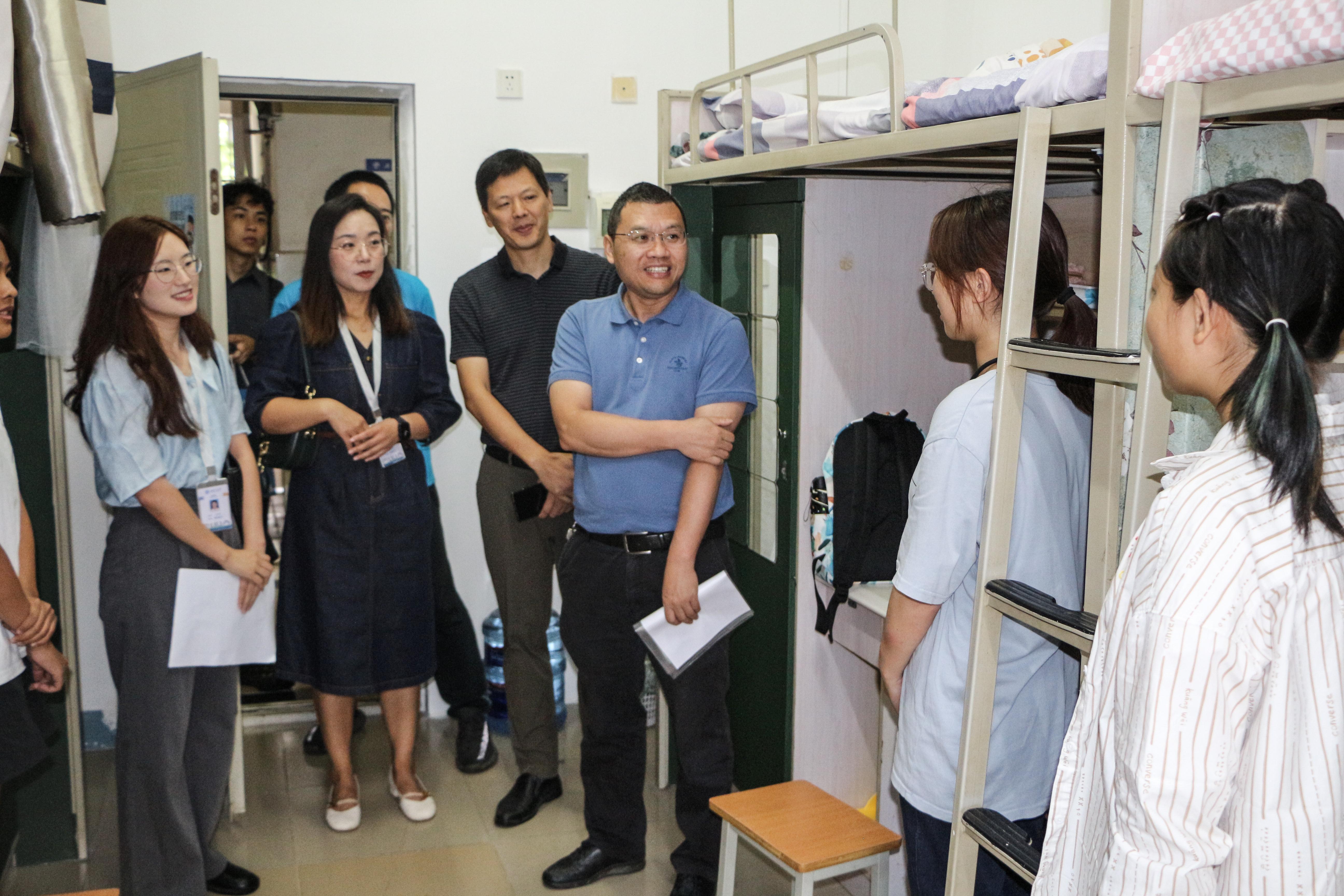 的思想动态和生活状态,帮助新生尽快适应大学生活,9月1日上午10点,学院院长周绍兵、党委书记李锦红、党委副书记于楠以及学工组全体老师深入走访2023级本科新生宿舍,为新同学送去关怀与问候。