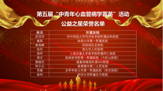第五届“中青年心血管病学菁英”活动由中华医学会心血管病学分会青年学组指导,于2023年4月正式启动,经过近1个月的征集,共有200余名心血管医生报名角逐四大殊荣。通过公平、公正、客观的专家评审,最终遴选出了科学科研创新荣誉10名、临床技术创新荣誉10名、公益之星荣誉10名和基层优秀医师荣誉13名得主。活动荣誉时刻特邀韩雅玲院士,中华医学会心血管病学分会(CSC)候任主任委员、首都医科大学附属北京安贞医院马长生教授,西安交通大学第一附属医院袁祖贻教授,中国医学科学院阜外医院杨跃进教授,吉林大学第二医院心内科主任刘斌教授,泰达国际心血管病医院李玉明教授,上海交通大学附属胸科医院何奔教授,中国医科大学第一附属医院孙英贤教授,北部战区总医院王祖禄教授,解放军总医院第二医学中心曹丰教授,云南省阜外心血管病医院牛国栋教授为荣誉得主颁发证书和奖杯。