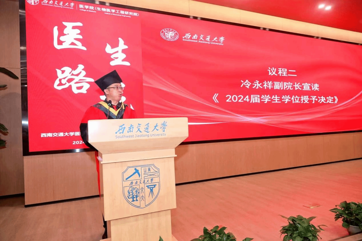 2024年6月学士、硕士学位授予决定》。随后,周绍兵院长、冷永祥副院长走上台前,亲自为生物医学工程(工学)2024届毕业生授位。他们庄重地将学位证书交到每一位毕业生手中,这不仅是对他们学业成绩的认可,更是对他们未来人生的美好祝愿。紧接着,医院导师周龙甫、王文春、孙晓滨、项涛也分别为生物医学工程(医学)、临床医学毕业生授位。