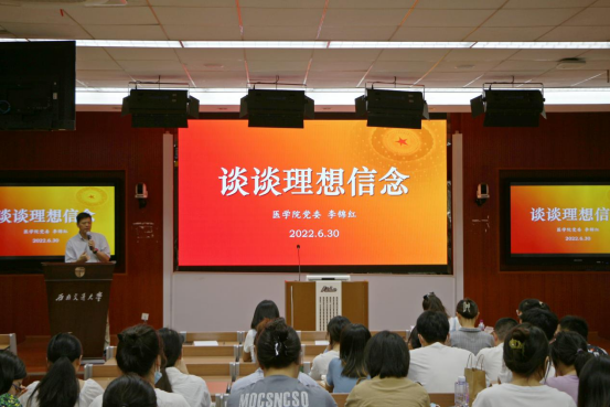 宣誓仪式结束后,党委书记李锦红为同志们讲授了专题党课《谈谈理想信念》。李锦红同志用深刻且易懂的语言,联系理论和实际,围绕“理想信念”这一主题,从以下三个方面做了讲授:一是为什么要谈谈关于人生理想的话题;二是医学生与“精医报国”人生理想;三是怎样树立践行“精医报国”人生理想。李锦红同志还借“中国肝胆外科之父”吴孟超院士的感人事迹告诫我们党员和入党积极分子要时刻谨记为人民服务的初衷,将这份执着与信念永远铭刻在自己的心里。