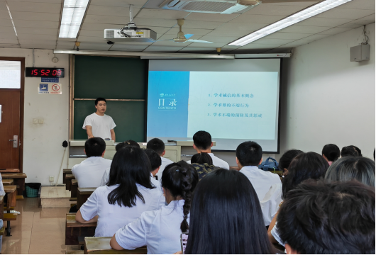 新生入学教育之“精勤研途”模块学术诚信主题分享会顺利拉开帷幕。此次分享会由2021级基础1班负责,主讲人姚权州同学以“恪守科学精神、坚守学术诚信”为主题进行汇报分享。