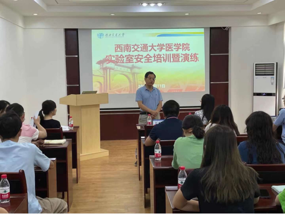 副院长翁杰担任总指挥,资实处安全科赵春花老师受邀为全体师生做实验室安全培训;成都利民消防宣传中心李斯杰教官做消防安全培训并全程指导应急演练活动。