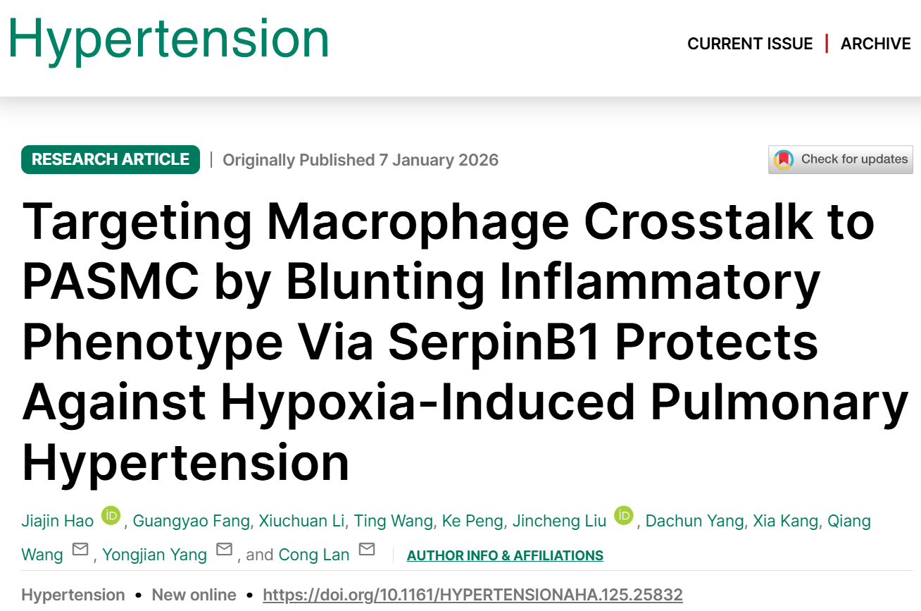 2023级在读硕士研究生郝佳瑾以第一作者在心血管领域权威期刊Hypertension(中科院1区TOP,影响因子8.2)发表了题为“Targeting macrophage crosstalk to PASMC by blunting inflammatory phenotype via SerpinB1 protects against hypoxia-induced pulmonary hypertension”的原创性论文。该研究首次揭示了巨噬细胞-肺动脉平滑肌细胞对话存在缺氧应答效应,并明确丝氨酸蛋白酶抑制剂B1(SerpinB1)下调是缺氧暴露诱导巨噬细胞炎症表型的关键机制,巨噬细胞SerpinB1过表达可有效阻断肺动脉周围巨噬细胞对肺动脉平滑肌细胞的“恶性对话”,减轻HPH。该研究为HPH的防治提供了新的理论支持和潜在治疗靶点。萝莉岛