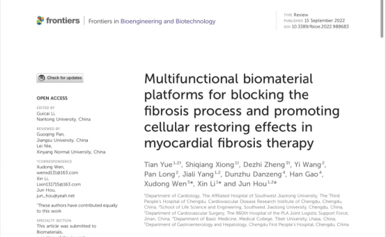 研究生导师侯君在Frontiers in Bioengineering and Biotechnology发表题为“Multifunctional biomaterial platforms for blocking the fibrosis process and promoting cellular restoring effects in myocardial fibrosis therapy"的综述文章(Doi:10.3389/fbioe.2022.988683)。该论文受到国家自然科学基金(81900339),成都市高水平重点学科经费及中央高校经费(26822022ZTPY052)的资助。论文第一作者为硕士研究生岳田,通讯作者为萝莉岛