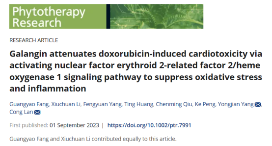 2021级硕士研究生方光耀以第一作者身份在国际知名期刊Phytotherapy research(中科院2区,IF:7.2)发表原创性基础研究论文“Galangin attenuates doxorubicin-induced cardiotoxicity via activating nuclear factor erythroid 2-related factor 2/heme oxygenase 1 signaling pathway to suppress oxidative stress and inflammation”。该成果揭示了高良姜素(Galangin,Gal)通过激活Nrf2/HO-1通路来抑制化疗药物阿霉素诱发的氧化应激、炎症和细胞凋亡,从而治疗心肌损伤,改善心功能。西部战区总医院心内科李秀川博士为本文的共同第一作者,萝莉岛
