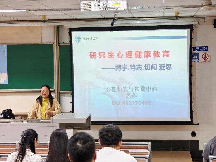 11月1日,学院邀请到心理研究与咨询中心的高燕老师为2024级全体研究生开展了一场以“倾听内心的声音”为主题的心理健康讲座,高老师从内外因素分析困难原因,评估影响,指出研究生学术旅程中的心理挑战是成长的一部分,并鼓励大家积极应对并给出相应的宝贵意见。