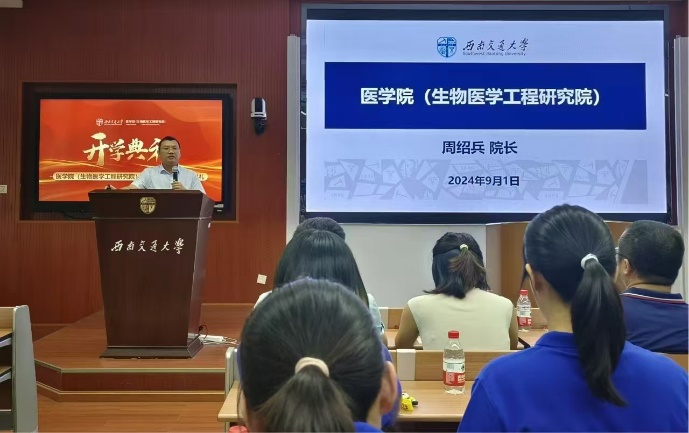的发展历程,详细介绍学院学科特点,展望了未来的宏伟蓝图。他强调了医学教育的重要性,鼓励同学们厚植家国情怀,号召新生们将个人发展与国家命运紧密相连,把科研成果应用在全面建设社会主义现代化国家的伟大事业中。