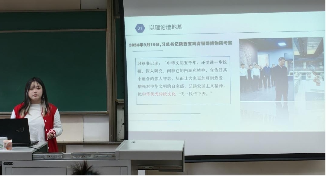 讲座伊始,宣讲人周诗嫣通过习近平总书记在陕西宝鸡青铜器考察时发表的一段话,引出了中华优秀传统文化的重要性,“中华优秀传统文化是中华民族的根和魂,是中华民族共同的精神家园,它增强了民族的认同感和凝聚力,是维系民族团结和社会稳定的重要精神纽带。作为世界文化多样性的重要组成部分,中华优秀传统文化对人类文明的进步和发展做出了独特贡献”。宣讲人表示,中华优秀传统文化是中华民族的宝贵财富,也是全人类文明的共同财富,它丰富全球文化多样性的同时,也增强国家文化软实力和国际影响力,并且推动了文明互鉴和全球文化和谐发展。因此中华优秀传统文化的传承和发展对于构建人类命运共同体、促进世界和平与繁荣具有不可替代的作用。