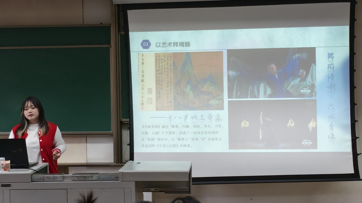 中华优秀传统文化与现代艺术相融合,能够产生独特的文化魅力和广泛的社会影响力。宣讲人以《只此青绿》为例,带领同学们感受了传统文化与现代艺术融合的巨大潜力,为宣传中华优秀传统文化提供了新的思路和方法,使得传统文化在全球化的今天能够以更加生动、现代的形式被广泛传播和接受。