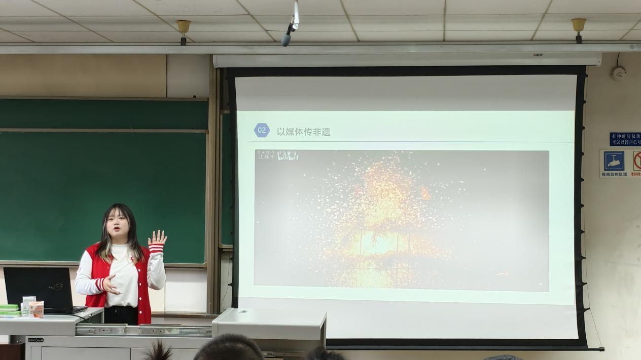 讲座中,宣讲人以媒体平台“哔哩哔哩”为例,展示了江寻千发布的打铁花视频。她的打铁花视频在该平台获得了极高的播放量和赞誉,以视频的形式分享打铁花的壮观美丽,也向世人展示了女性的力量和非物质文化遗产的魅力,制造了强大的传播效应,激励着更多的青年人关注传统文化、参与文化传承,展现了新时代青年的风采和力量。
