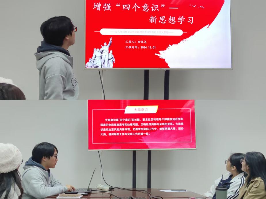 A座215会议室,领学人金煜尧同学围绕“四个意识”,即政治意识、大局意识、核心意识和看齐意识向同学们做了深入讲解。他谈到,在复杂多变的国际国内环境中,作为新时代的青年学子,必须不断提高自身的政治敏锐性和鉴别力,始终做到心中有党、心中有民、心中有责、心中有戒。此外他还结合实际案例,生动形象地阐释了如何在日常学习生活中践行“四个意识”,树立正确的世界观、人生观、价值观,为个人成长和社会进步贡献智慧和力量。