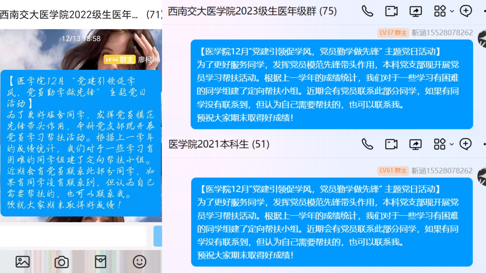 针对非新生年级部分学习困难的同学,党支部迅速行动,建立了学习帮扶小组。所有党员共组成9个帮扶小组,通过点对点的方式,对2023级、2022级、2021级挂科多、学习困难的同学进行精准帮扶。帮扶形式主要包括学习笔记分享和学习问题答疑解惑,有效提升了帮扶对象的学习效率和成绩。