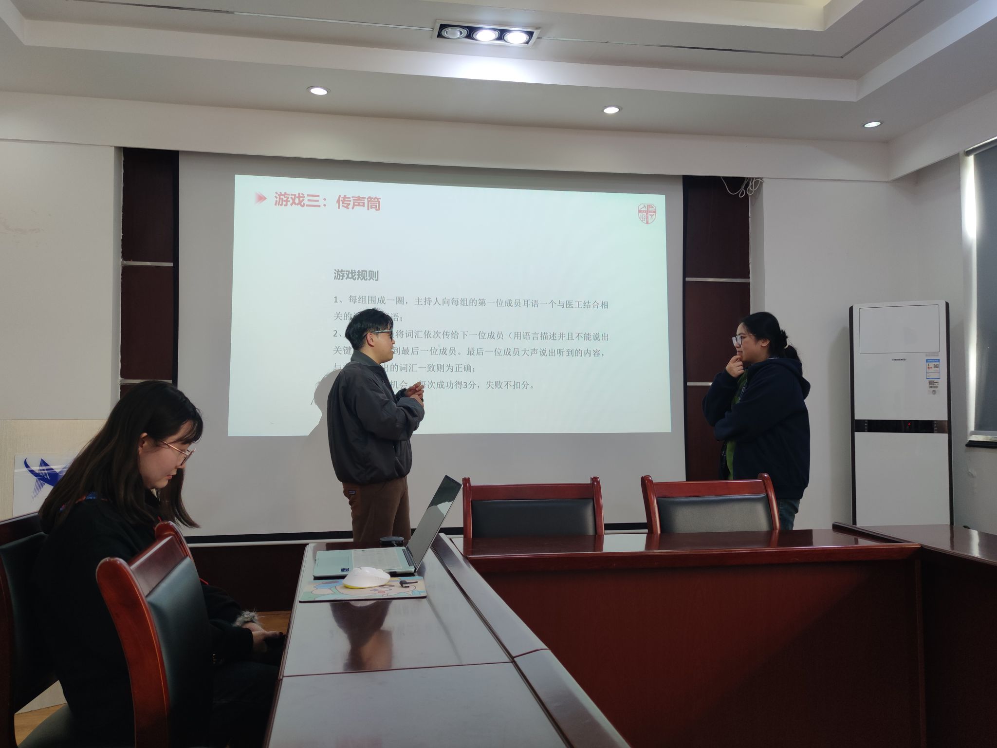 紧接着的“头脑风暴”环节,各小组围绕医工结合主题设计团队口号,创意十足且各具特色,每队成员就口号展开了自己详细的阐述和理解。最后的“传声筒”游戏,主要针对相关专业的名词展开描述并进行传递,一方面考验对专有名词的理解是否透彻,另一方面考验了团队成员之间的默契与沟通能力。