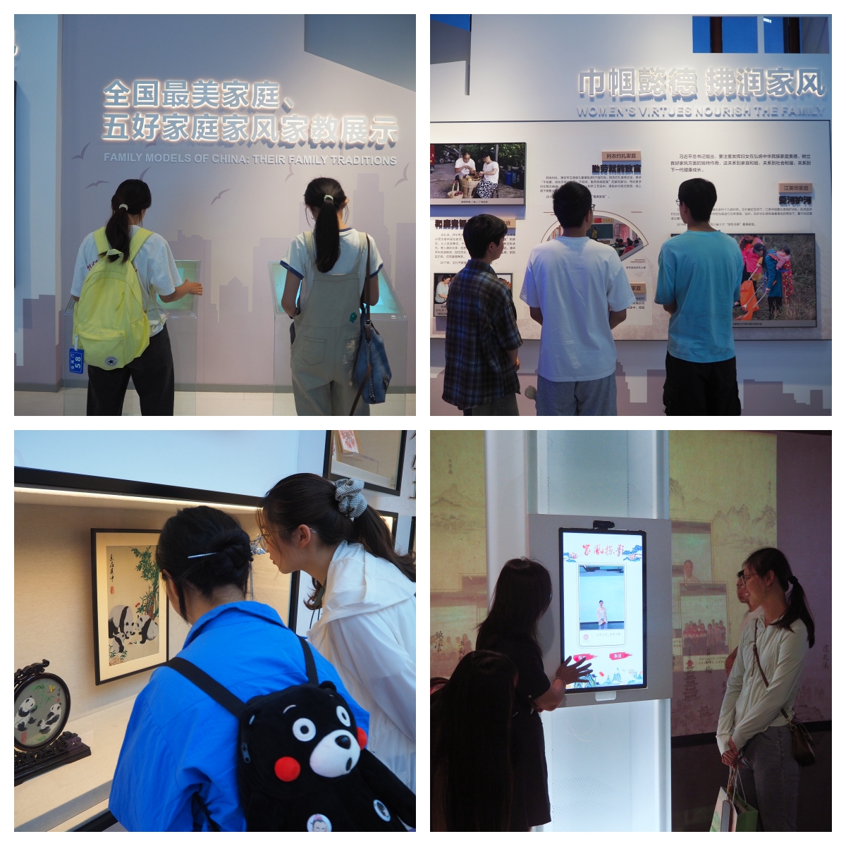 天府家风馆作为全国规模最大的家风家教主题展馆,通过“先贤家风”“红色家风”“当代家教”“时代新家”四大主展厅及“战地家书剧场”“杨氏家风文化体验厅”两大专题展厅,系统呈现了中华优秀传统家风、革命先辈家国情怀与新时代家庭文明新风尚。在讲解员的引导下,学生党员们驻足于周恩来“十条家规”、朱德“借钱资母”等历史故事前,深刻感悟老一辈革命家心底无私、天下为公的高尚品格;在“战地家书剧场”,通过沉浸式观影体验,重温了赵一曼、江竹筠等川籍英烈的家书,深刻体会“家书纸短、家国情长”的革命精神。