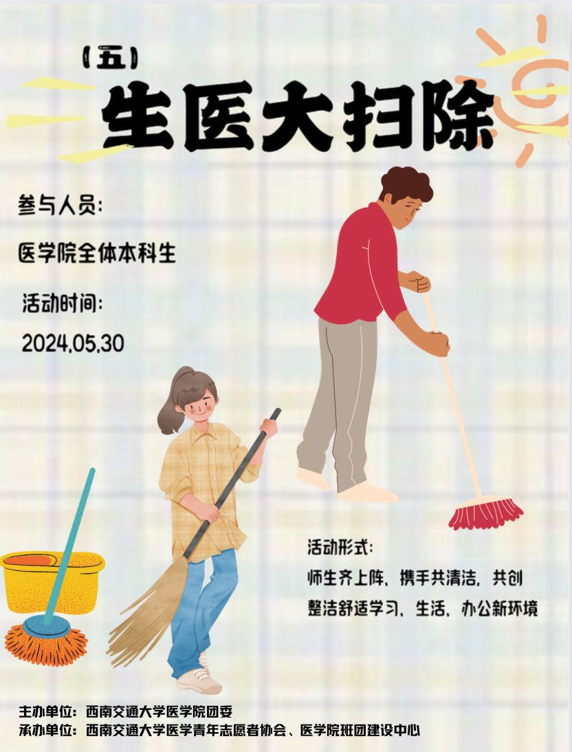 初夏炎炎,劳动当时。为弘扬劳动精神、增强劳动意识、凝聚奋进力量,引导萝莉岛 学生崇尚劳动、热爱劳动、尊重劳动,萝莉岛 青协与萝莉岛 班团建设中心联合开展的“生医大扫除”活动又来啦。请大家积极参加,为营造良好寝室环境共同努力!