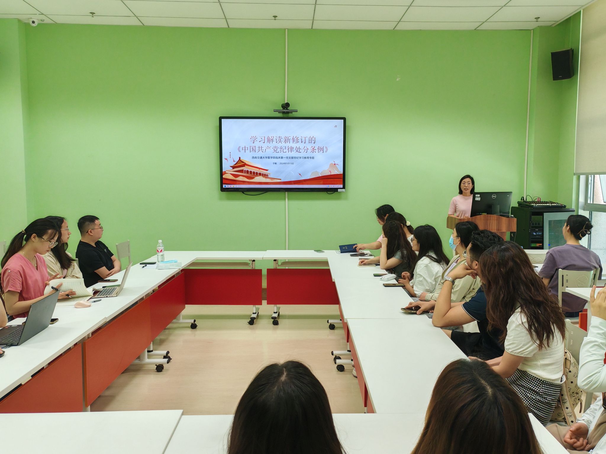 于楠同志以“学习解读新修订的《中国共产党纪律处分条例》”为题为大家讲授了纪律党课,领学了新修订的《中国共产党纪律处分条例》(以下简称《条例》)总则以及违反六大纪律的处分条例等主要内容,随后全体党员联系思想和工作心得交流了心得体会。