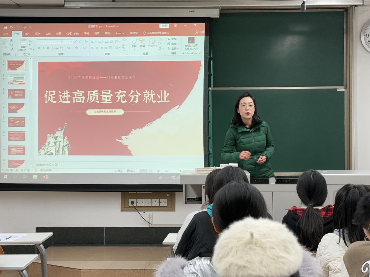 随后,于楠副书记为全体党员讲授《促进高质量充分就业》主题党课 。于楠副书记结合当前就业形势以及生医系研究生的就业现状,从“能就业,好就业,就好业”三方面展开讲解,告诉大家客观上要提升自己的能力,提升自我价值;主观上要保持积极向上的心态,乐观主动进取,先就业再择业。对于同学们而言,就业不仅仅是个人未来生活的保障,更是实现自身价值、投身国家建设的重要途径,作为新时代的学生党员,要紧跟国家发展战略,不断提升自身综合素质,努力成为国家需要的高素质人才。