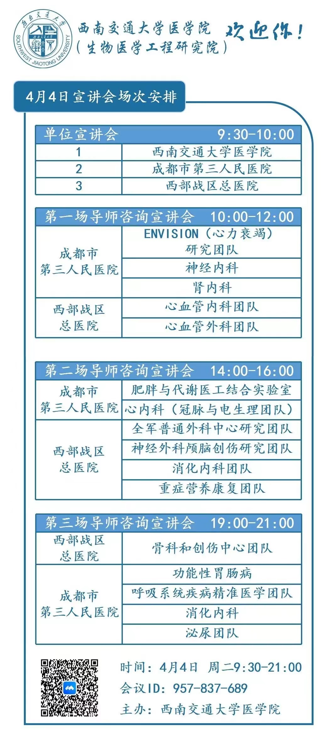 根据学院招生需求,可接受部分临床医学(学术型)考生调剂。为帮助广大考生更深入了解萝莉岛 研究生导师团队相关信息,学院将于4月4日邀请部分导师团队召开线上咨询会。欢迎有意愿调剂到萝莉岛 的考生,通过腾讯会议平台与学院导师团队进行线上互动交流。