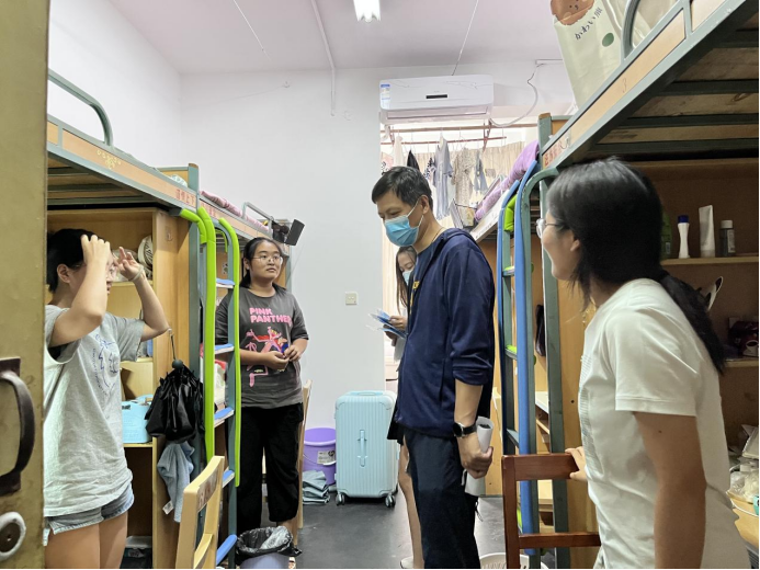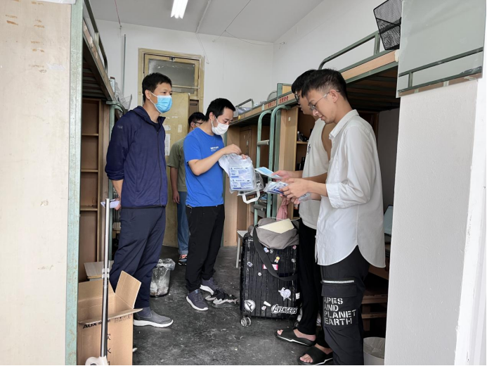 党委书记李锦红、学生工作组副组长胡豪、辅导员黄雪梅及高年级学生代表共同走访学生宿舍,给同学们发放防疫物资。萝莉岛