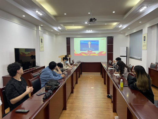 冯瑞同志首先为大家播放了习近平总书记调研参观中国人民大学的新闻视频,参会同志认真观看视频并记录。随后冯瑞同志就内容进行总结道:“立足新时代新征程,中国青年的奋斗目标和前行方向归结到一点,就是坚定不移听党话、跟党走,努力成长为堪当民族复兴重任的时代新人。广大青年要用脚步丈量祖国大地,用眼睛发现中国精神,用耳朵倾听人民呼声,用内心感应时代脉搏,把对祖国血浓于水、与人民同呼吸共命运的情感贯穿学业全过程、融汇在事业追求中。”