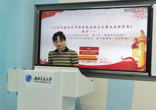 刘佳同志由两个问题入手,领学了关于“习近平新时代中国特色社会主义事业总体布局”中的文化布局部分。刘佳同志在会前,就向支部党员、积极分子抛出了这两个问题:1.为什么说文化自信是更基础、更深厚的自信?2.为什么说中华优秀传统文化不能丢,丢了就割断了精神命脉?刘佳同志表示,中国文化包括博大精深的优秀传统文化,鲜明独特、奋发向上的革命文化以及承前启后、继往开来的社会主义先进文化。而一个民族的复兴需要强大的物质力量,也需要强大的精神力量,没有高度的文化自信,没有文化的繁荣兴盛,就没有民族伟大复兴。我们不仅要提高文化硬实力,也要加强文化软实力的建设。在领学过程中,刘佳同志还通过一个视频对于“习近平新时代中国特色社会主义事业总体布局”进行了详细介绍,加深了同学们的印象。