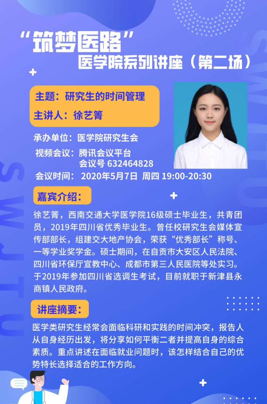讲座摘要:医学类研究生经常会面临科研和实践的时间冲突,报告人从自身经历出发,将分享如何平衡二者并提高自身的综合素质。重点讲述在面临就业问题时,该怎样结合自己的优势特长选择适合的工作方向。