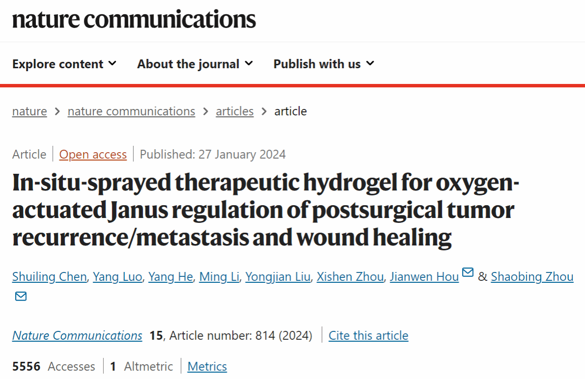 周绍兵教授团队侯建文副教授等人在肿瘤术后辅助治疗领域取得重要进展,相关研究成果以“In-situ-sprayed therapeutic hydrogel for oxygen-actuated Janus regulation of postsurgical tumor recurrence/metastasis and wound healing”为题发表在国际权威期刊《Nature Communications》上,并被期刊编辑部选入“材料科学与化学”(Materials science and chemistry)领域亮点推荐(Editors’ Highlights)文章。该专栏旨在精选近期发表在该领域的少数最具突破性和影响力的论文作为亮点向读者重点推荐。论文第一单位为萝莉岛